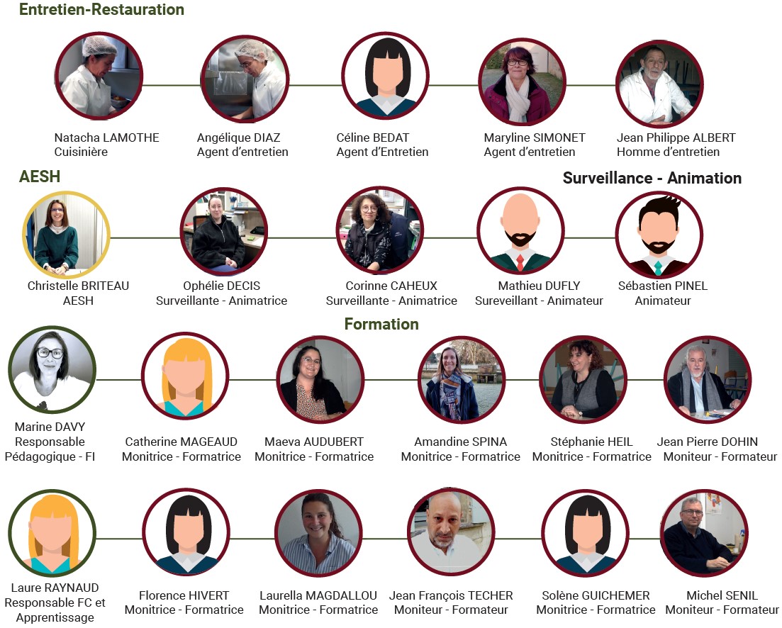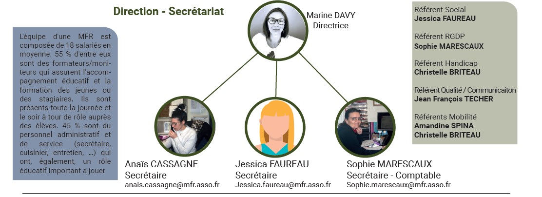 La Directrice de la Maison Familiale Rurale du Libournais anime une équipe de 28 salariés : des formateurs, une équipe administrative, une équipe de surveillance et d’animation, une équipe de restauration / entretien. Chaque membre, quelle que soit sa fonction, accompagne l’apprenant dans son parcours à la MFR.
